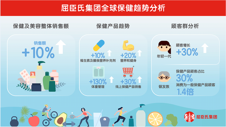 随着顾客健康消费需求转变,预防保健意识提升,以及保健产品品类的快速增长,屈臣氏集团保健业务正加速发展。在过去12个月里,集团整体保健及美容产品销售额增长超过10%,其中维生素及膳食营养补充剂销售额增长超过10%,而营养和健身类产品的销售额更提升超过20%。