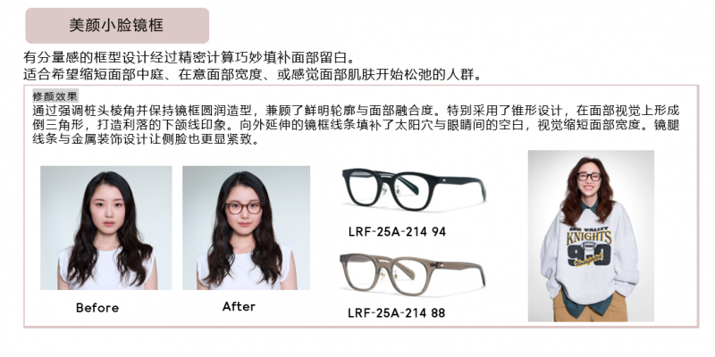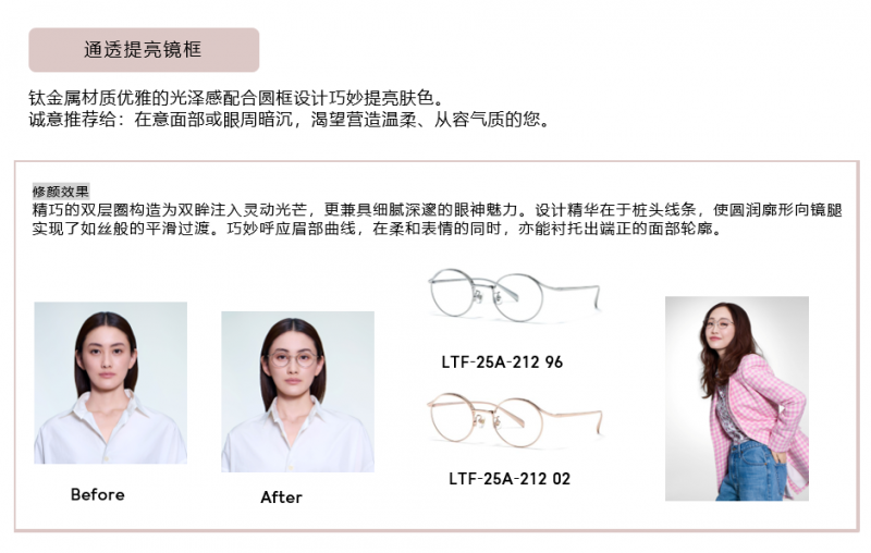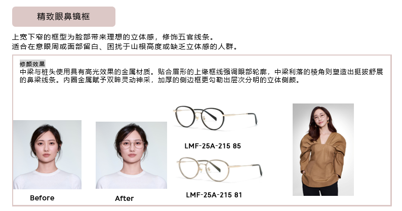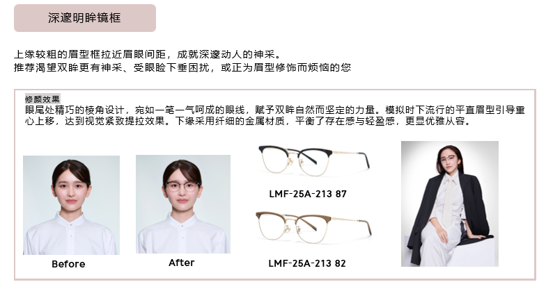 “修饰成年女性的肌肤状态与骨骼轮廓,戴上便能展现出众的时尚感。”为了实现这一理想目标,该系列从材质、框型到细节均倾注心力,针对成年女性的困扰打造出共4型8种眼镜。“美颜小脸镜框”:有效填补脸部留白,视觉上收紧轮廓。“深邃明眸镜框”:赋予双眸力量感的同时,营造出灵动的“松弛感”。“通透提亮镜框”:全面提升面部色调,让肤色更显通透。“精致眼鼻镜框”:为面部平添立体感,使五官更显深邃分明。